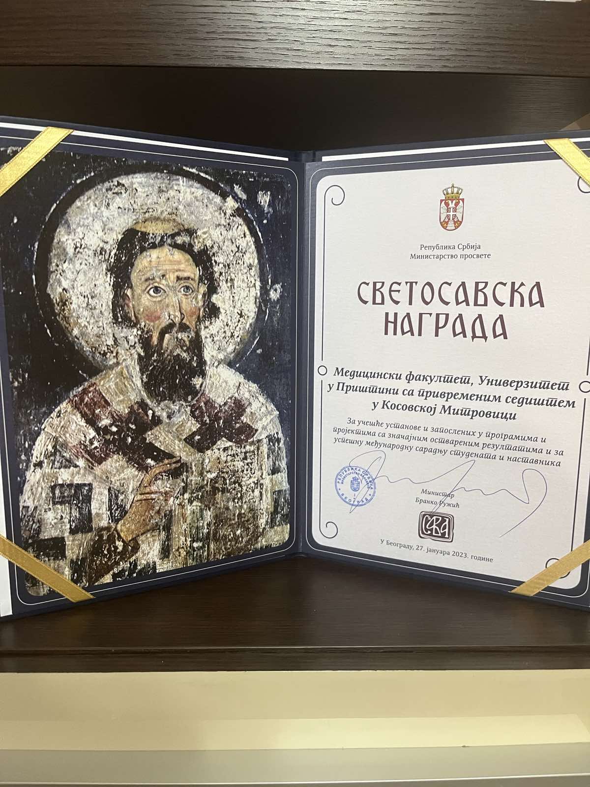СВЕТОСАВСКА НАГРАДА објављено 27/01/2023 од Медицински факултетМедицински факултет универзитета у Приштини, добитник је Светосавске награде за учешће установе и запослених у програмима и пројектима са значајним оствареним резултатима и за успешну међународну студената и наставника.Београд, 27.01.2023. године.